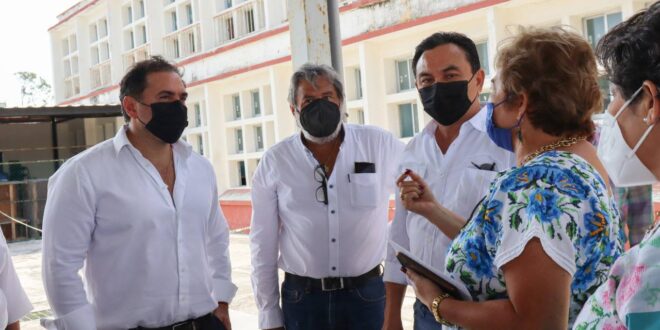 PROGRESO, Yuc., 18 de mayo 2022.- Diferentes trabajos se realizarán en la escuela “Maniobras Marítimas” y el preescolar “Juan Crisóstomo Cano y Cano”, mencionó alcalde Julián Zacarías Curi, durante un recorrido realizado esta mañana por ambas escuelas, en donde acompañó al Secretario de Educación, Liborio Vidal Aguilar; y al diputado por el IX Distrito, Erik Rihani González.