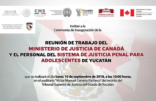 En el marco de un proyecto de cooperación Canadá-México, autoridades de ese país y de las instituciones de los poderes Ejecutivo y Judicial de Yucatán que intervienen en el sistema de justicia para adolescentes, se reunirán en esta ciudad del 10 al 12 de septiembre próximos, con el fin de coordinar la implementación, en modo piloto, de un nuevo Modelo Nacional de Atención de Adolescentes del Sistema de Justicia Penal (MNAASJP).
