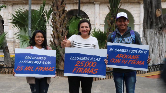 Esta mañana en la plaza grande de la ciudad de Mérida, la aspirante a candidata independiente a la gubernatura de Yucatán Sofía Castro Romero recabó la firma número 25 mil.