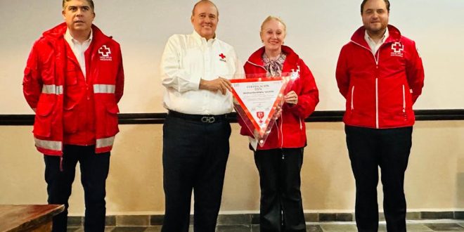 Mérida, Yucatán a 24 de febrero de 2023.- De manos del Presidente Nacional de Cruz Roja Mexicana, Lic. Fernando Suinaga Cárdenas, la Delegada Estatal, Michelle Byrne de Rodríguez recibió la certificación Desarrollo de la Sociedad Nacional (DSN) que hace constar que la Delegación Estatal Yucatán cumplió con la primera etapa de la Alineación Estratégica Nacional.