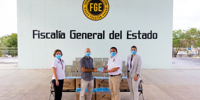 José Antonio Silveira Bolio estuvo en el edificio central de la FGE, en dónde entregó varias cajas de mascarillas a David Cetina Manrique, secretario técnico, Fátima del Rocío Ancona Salazar, Directora de Recursos Humanos y Lizette Mimenza Herrera, Vicefiscal de Prevención, en representación del Fiscal General del Estado, Juan Manuel León León.