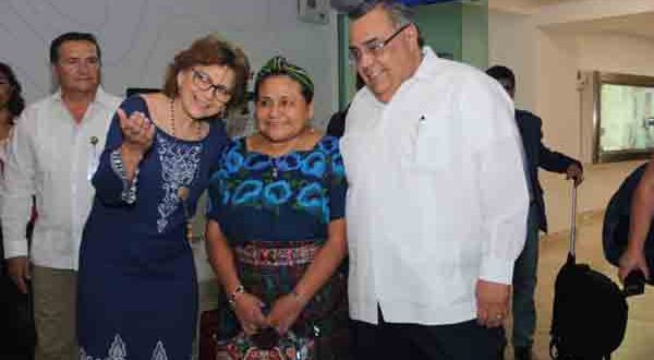 A su llegada al Aeropuerto de esta capital, la líder indígena, promotora de la paz, se congratuló con la administración que encabeza el Gobernador Mauricio Vila Dosal, por su anfitrionía y por regresar a la tierra de sus ancestros mayas, como invitada de honor a tan significativo foro.