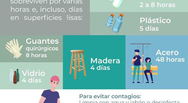 El especialista señaló que los virus como el SARS-CoV-2, causante del COVID-19, sobreviven por varias horas e incluso días en superficies lisas, como: papel, de cuatro a cinco días; aluminio, de dos a ocho horas; plástico cinco días; guantes quirúrgicos ocho horas; vidrio y madera, cuatro días; y acero, 48 horas.