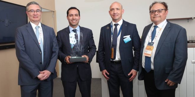 Zumpango de Ocampo, Estado de México, 26 de abril de 2023.- Por la confianza para invertir en el futuro de los jóvenes y la industria aeronáutica que actualmente ha consolidado más de 5,000 empleos en el estado, Yucatán recibió un reconocimiento de la empresa Airbus, el cual se dio al Gobernador Mauricio Vila Dosal, durante su participación en la quinta edición de la Feria Aeroespacial México (Famex) 2023.