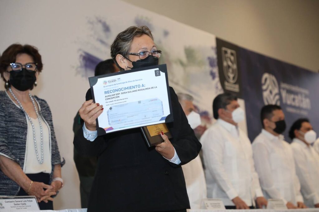 -En representación del Gobernador Mauricio Vila Dosal, la secretaria General del Gobierno, María Fritz Sierra, entregó placas e incentivos a 643 agentes por “Años de servicio” y a 348, “Mérito policial”.