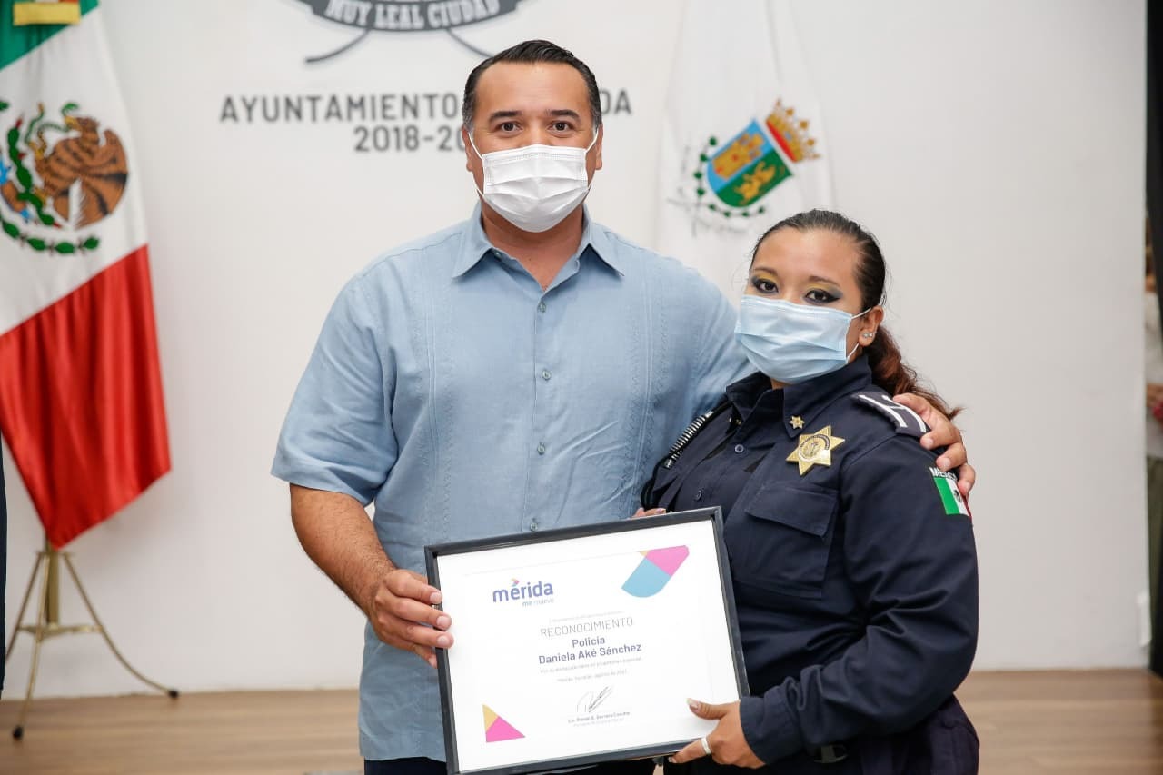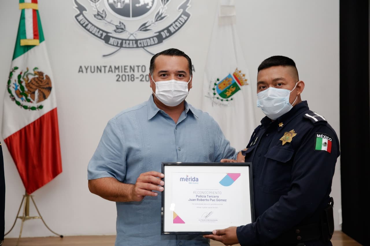 En una breve pero significativa ceremonia que tuvo lugar en la sala de prensa del Ayuntamiento de Mérida, Barrera Concha reconoció dicha acción la cual dijo, representa un incentivo para los demás elementos de la corporación policiaca al darle realce a la importante labor que realizan para proteger y brindar seguridad a las y los meridanos.