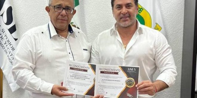 Progreso, Yucatán a 25 de febrero de 2023. Esta semana, el alcalde de Progreso, Julián Zacarías Curi recibió reconocimiento de manos del Auditor Superior del Estado de Yucatán, el contador público, Mario Can Marín, esto por la rendición de cuentas, análisis y transparencia correspondiente al gasto públicos de 2022 de su administración municipal.