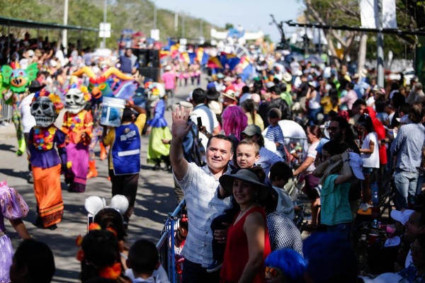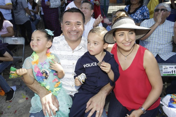 El alcalde Renán Barrera Concha y su esposa, Diana Castillo Laviada, presidenta del DIF Municipal, acompañados de sus hijos Renán y Daniela presenciaron el derrotero desde su palco, a donde llegaban invitados especiales y gente en general a saludarlo. Los hijos del alcalde en esta ocasión acudieron disfrazados de Jazmine y de Policía.