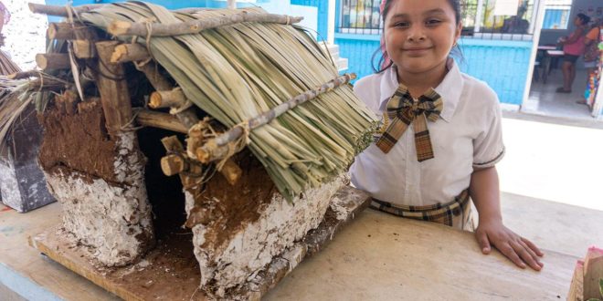 Luz María Cetz Cetina, alumna del tercer año, explicó que en la elaboración de su casita maya se inspiró en la casa antigua de sus abuelos, y con ayuda de sus padres realizó la réplica exacta, utilizando barro, guano y madera, para lograr la tradicional vivienda maya.