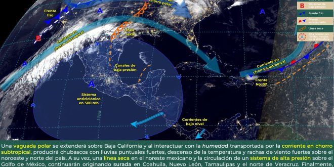 El ingreso de aire marítimo tropical proveniente del mar Caribe hacia la península de Yucatán, continuarán generando cielo despejado a parcialmente nublado sin probabilidad de lluvias en Yucatán, Campeche y Quintana Roo. Asimismo, se prevé viento del sureste de 15 a 25 km/h y rachas mayores a 40 km/h en zonas costeras. Ambiente templado a cálido durante la madrugada y caluroso en la tarde.