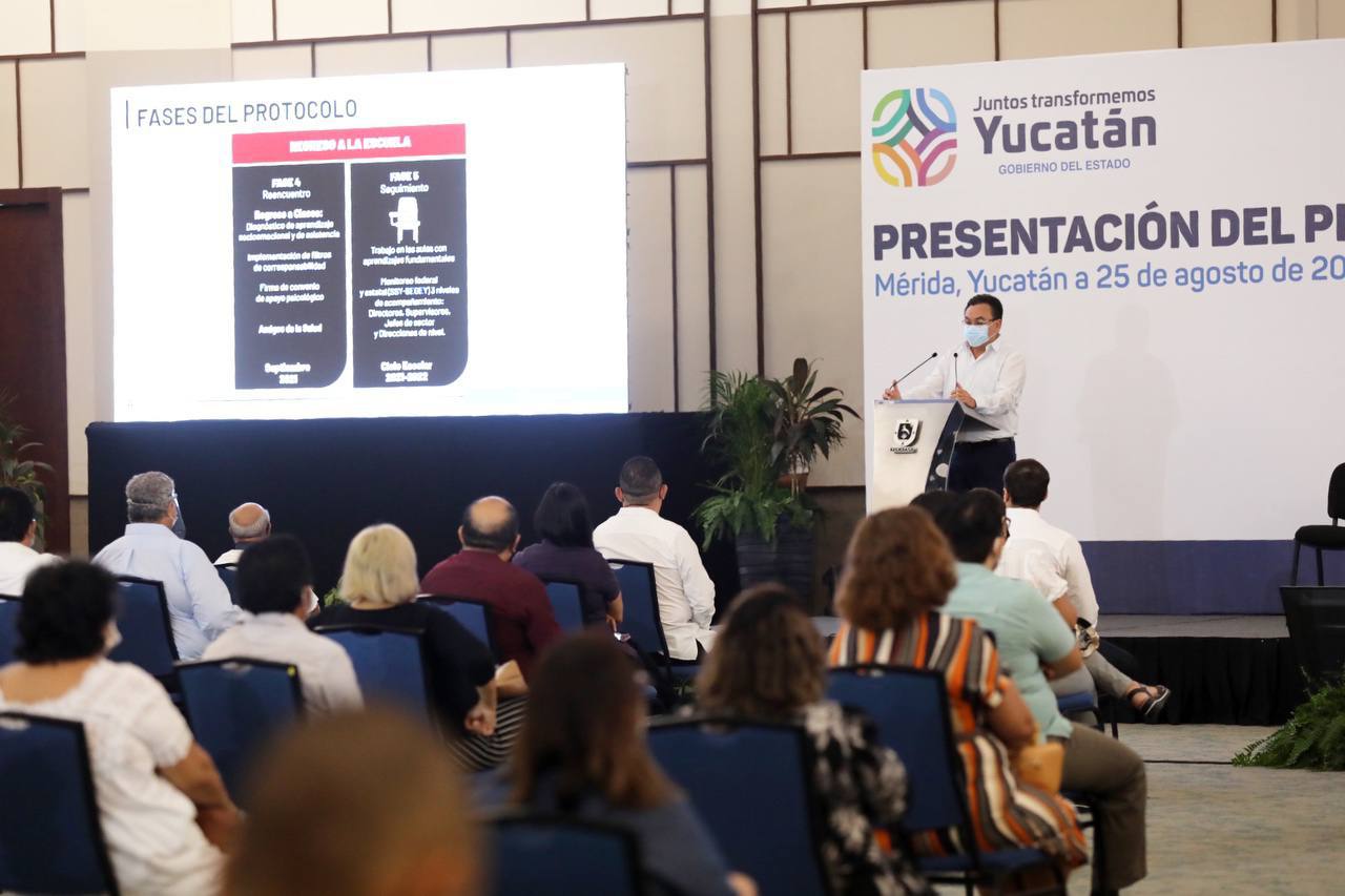 Mérida, Yucatán, 25 de agosto de 2021.- El regreso a clases en Yucatán es voluntario, cada mamá, papá y tutor decidirán si mandan a sus hijos a clases presenciales o continúan con el método a distancia. Quienes tengan alguna razón para no mandar a sus hijos a la escuela, no será necesario hacerlo y podrán continuar estudiando a través de los medios digitales como se ha hecho hasta ahora y quienes sí tienen el deseo de que sus hijos regresen a la escuela, podrán hacerlo con todas las medidas y filtros sanitarios para proteger la salud de todos los yucatecos, afirmó el Gobernador Mauricio Vila Dosal al presentar el Protocolo Estatal para un regreso seguro a clases.