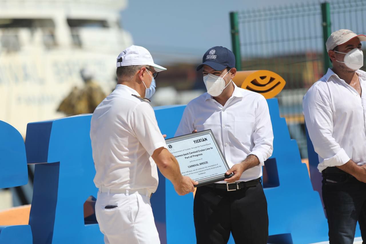 En el acto de reinicio de operaciones de la industria de cruceros en el estado, el Gobernador realizó el intercambio de placas con el Capitán de la embarcación, Rocco Lubrano, acto que también realizó el director de la Administración Portuaria Integral (API), Almirante en retiro Jorge Carlos Tobilla Rodríguez. Por su parte, el capitán del Carnival Breeze entregó a Vila Dosal un reconocimiento en nombre de la naviera.