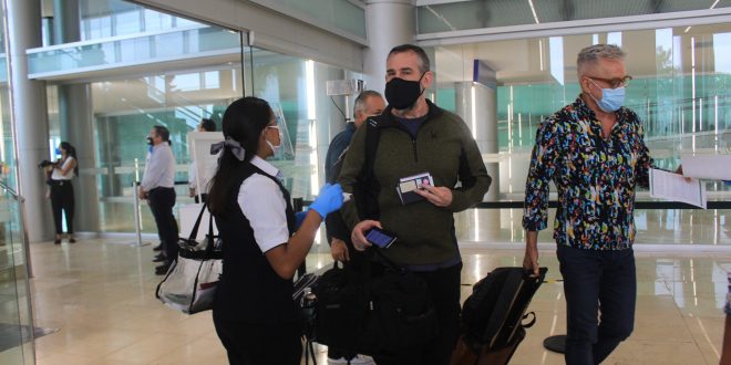 A su llegada, en la sala de migración, las y los recién llegados pasaron por un filtro sanitario, donde se verificaron las medidas sanitarias correspondientes: toma de temperatura, gel antibacterial y el uso obligatorio de cubrebocas, como parte del protocolo de bioseguridad implementado por el Grupo Aeroportuario de Sureste (ASUR), mismo que cuenta con el Certificado de Buenas Prácticas Sanitarias Yucatán emitido por la Sefotur y, a su vez, avalado por el sello Safe Travels del Consejo Mundial del Viaje y el Turismo (WTTC, por sus siglas en inglés).