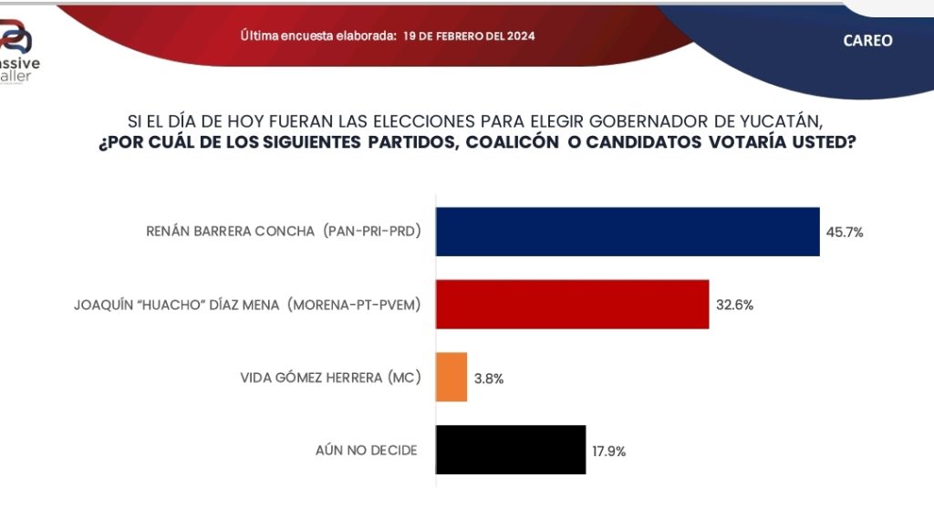 Mérida, Yuc., 20 febrero 2024.- A menos de 15 días de que arranque oficialmente la campaña electoral, el liderazgo de Renán Barrera Concha por la gubernatura del estado continúa la alza, así lo revelaron de nueva cuenta los resultados de un sondeo realizado por la casa encuestadora Massive Caller, dados a conocer el 19 de este mes.