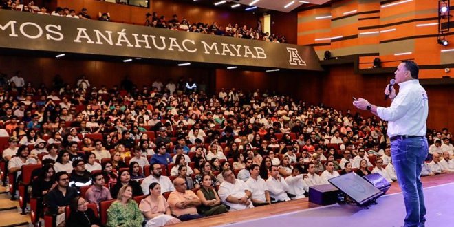 -Con aforo lleno en la Universidad Anáhuac Mayab, Renán Barrera habló sobre sus proyectos para Yucatán.