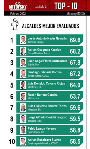 En ranking MITOFSKY 100 Alcaldes y alcaldesas de México, la aprobación promedio fue de 46%, dos puntos porcentuales menos que en la edición de diciembre. El primer puesto lo ocupa el alcalde Jesús Antonio Nader Nasrallah, de Tampico, Tamaulipas aprobado por el 69.6% y también del estado de Tamaulipas, en el segundo lugar se coloca Adrián Oseguera de Ciudad Madero, aprobado por 68.2% mientras que en las posiciones 99 y 100 con aprobaciones menores a 24% se ubican dos acaldes de estado de Morelos, Rodrigo Luis Arredondo de Cuautla y José Luis Uriostegui de Cuernavaca.