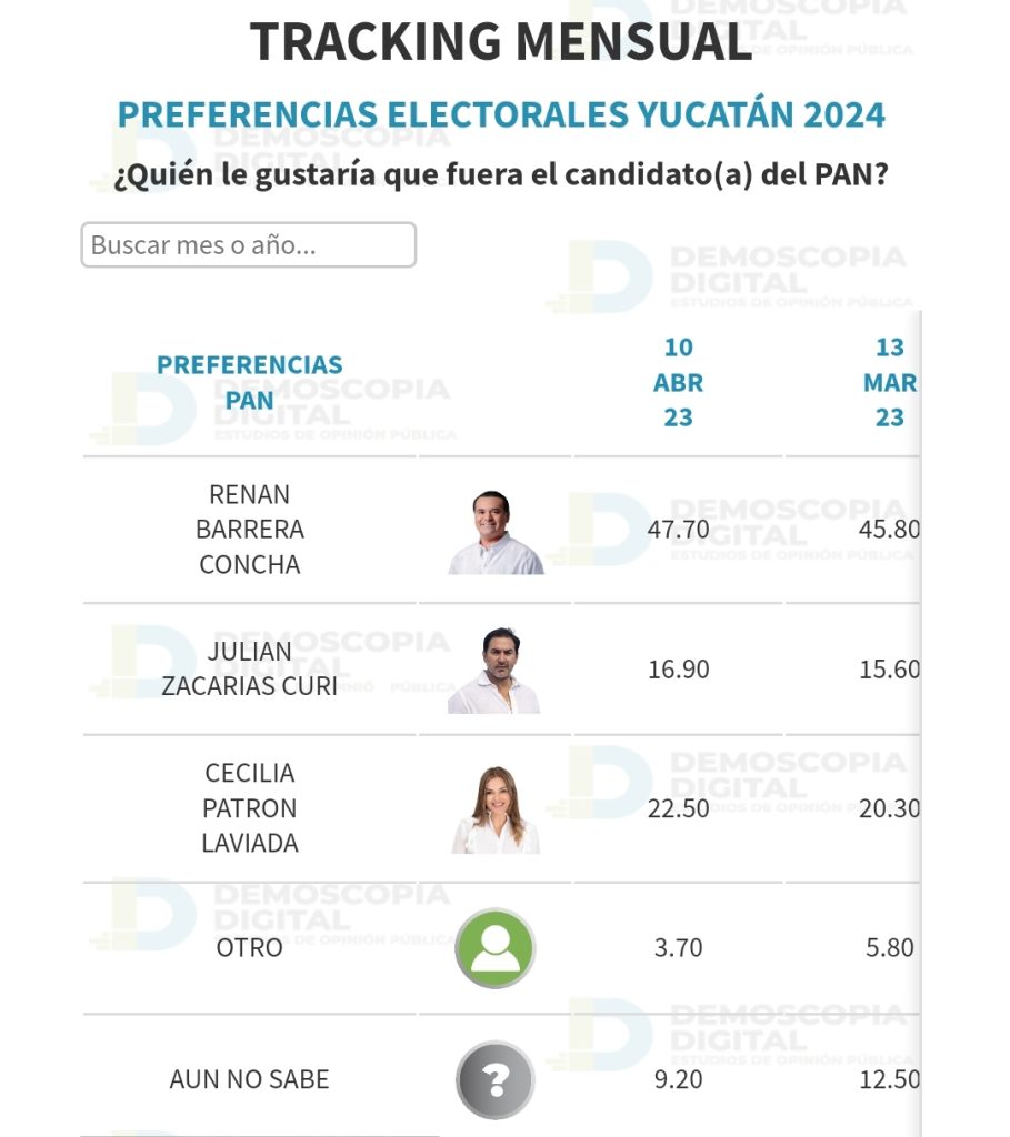 Mérida, Yuc., 11 de abril 2023.- El Alcalde de Mérida, Renán Barrera Concha continúa como el favorito para encabezar la candidatura por el PAN a la Gubernatura en el 2024, pues se encuentra en la cima de preferencias ciudadana, de acuerdo a la encuestadora Demoscopia publica un documento con tracking mensual desde octubre del 2022 sobre las 9 gubernaturas del 2024.