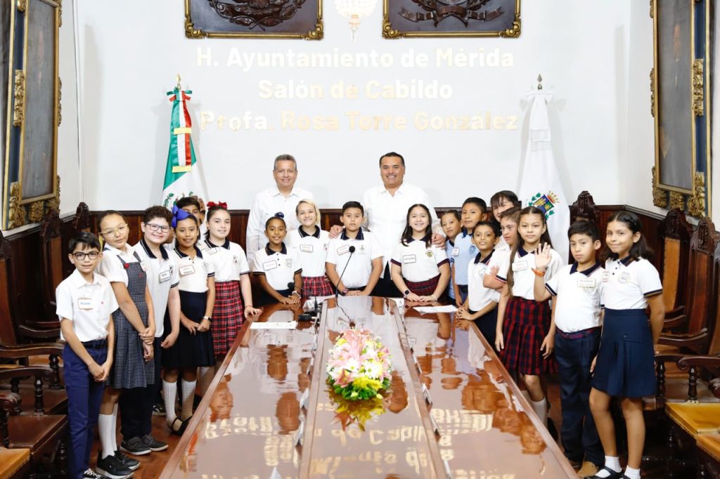 Mérida, Yucatán a 19 de abril de 2023.- Para fomentar que las próximas generaciones participen con propuestas e ideas que construyan una sociedad armónica, con justicia social y con decisiones colegiadas entre gobierno y ciudadanía, el Ayuntamiento de Mérida que preside Renán Barrera Concha realizó la Tercera Edición del Cabildo Infantil “La niñez unida por la mediación”.