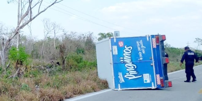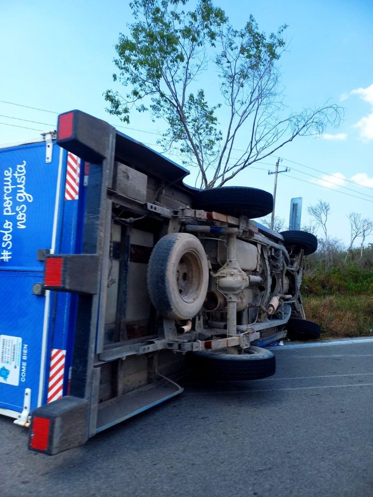 Celestún, Yuc., a 8 de mayo.- Una camioneta repartidora de Marinela terminó volcada este lunes en la peligrosa vía del tramo Celestún-Kinchil, exactamente a la altura del kilómetro 75.