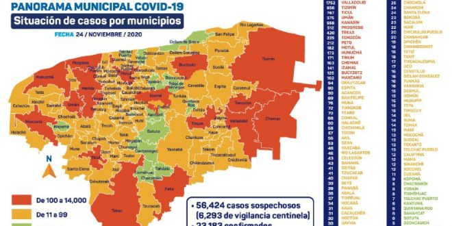 Mérida, Yucatán, 24 de noviembre de 2020.- Este es el parte médico de este martes 24 de noviembre: Como hemos señalado, en la reapertura económica los datos más importantes son la ocupación hospitalaria y los ingresos diarios. El día de hoy tenemos 133 pacientes en hospitales públicos. 19,786 pacientes ya se recuperaron: no presentan síntomas ni pueden contagiar. Esta cifra representa el 85% del total de contagios registrados, que son 23,183. Hoy se detectaron 114 nuevos contagios de Coronavirus.
