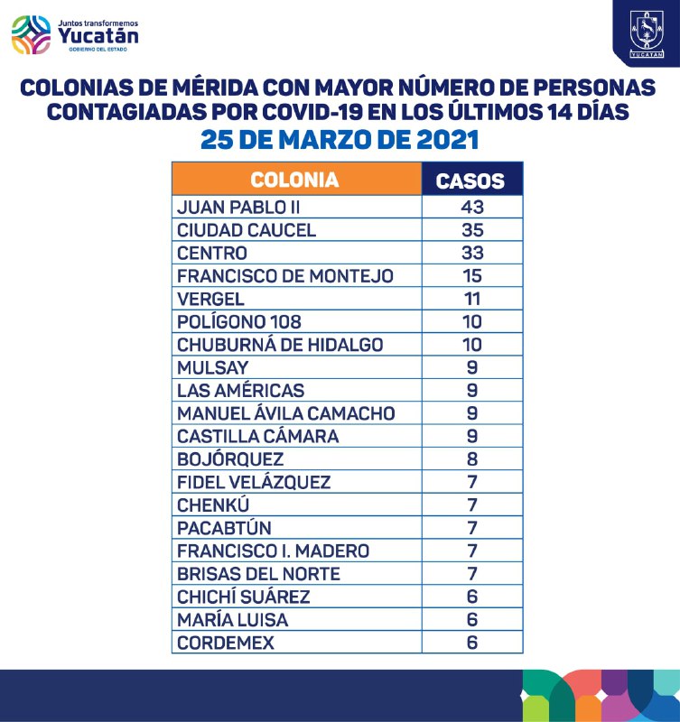 LAS COLONIAS DE MÉRIDA CON MAYOR NÚMERO DE PERSONAS CONTAGIADAS SON (casos diagnosticados en los últimos 14 días):
