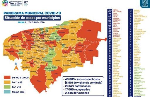 Específicamente, en Mérida se han diagnosticado 11,638 personas contagiadas de Coronavirus (casos acumulados al 20 de octubre), que viven en:
