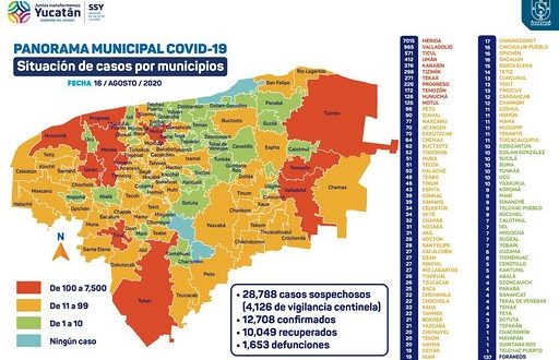 Mérida, Yucatán, 16 de agosto de 2020.- A continuación, el parte médico de este domingo 16 de agosto: 10,049 pacientes ya se recuperaron: no presentan síntomas ni pueden contagiar. Hoy se detectaron 169 nuevos contagios de Coronavirus.
