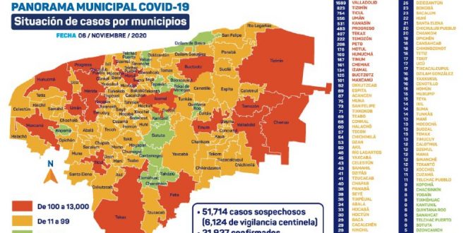 LOS MUNICIPIOS DE YUCATÁN CON MAYOR NÚMERO DE PERSONAS CONTAGIADAS SON (casos acumulados al 5 de noviembre):