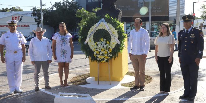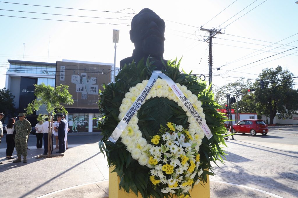 Mérida, Yucatán a 5 de febrero de 2025.- La Presidenta de la Mesa Directiva del Congreso del Estado, Diputada Estefanía Baeza Martínez y el Presidente de la Junta de Gobierno y Coordinación Política, Diputado Wilmer Monforte Marfil acompañaron al Secretario General de Gobierno, Omar Pérez Avilés en la ofrenda floral realizada en el marco del aniversario de la promulgación de la Constitución Política de los Estados Unidos Mexicanos de 1917 que rige la vida democrática del país.