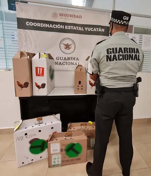 MÉRIDA, Yuc., 06 de diciembre 2021.- Ocho ejemplares de aves conocidas como Faisán fueron rescatadas por elementos de la Guardia Nacional (GN), en coordinación con personal de la Procuraduría Federal de Protección al Ambiente (Profepa), en el Aeropuerto Internacional de Mérida, procedentes de Guadalajara, Jalisco. Al realizar inspecciones de seguridad en una empresa de mensajería y paquetería de la terminal aérea, se localizaron ocho cajas de cartón, con las aves