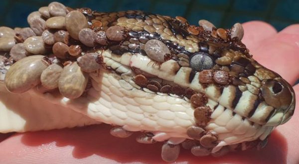 Las garrapatas suelen elegir víctimas enfermas y tal vez esta pitón tenía sus defensas muy bajas cuando las primeras se aferraron a su cuerpo.