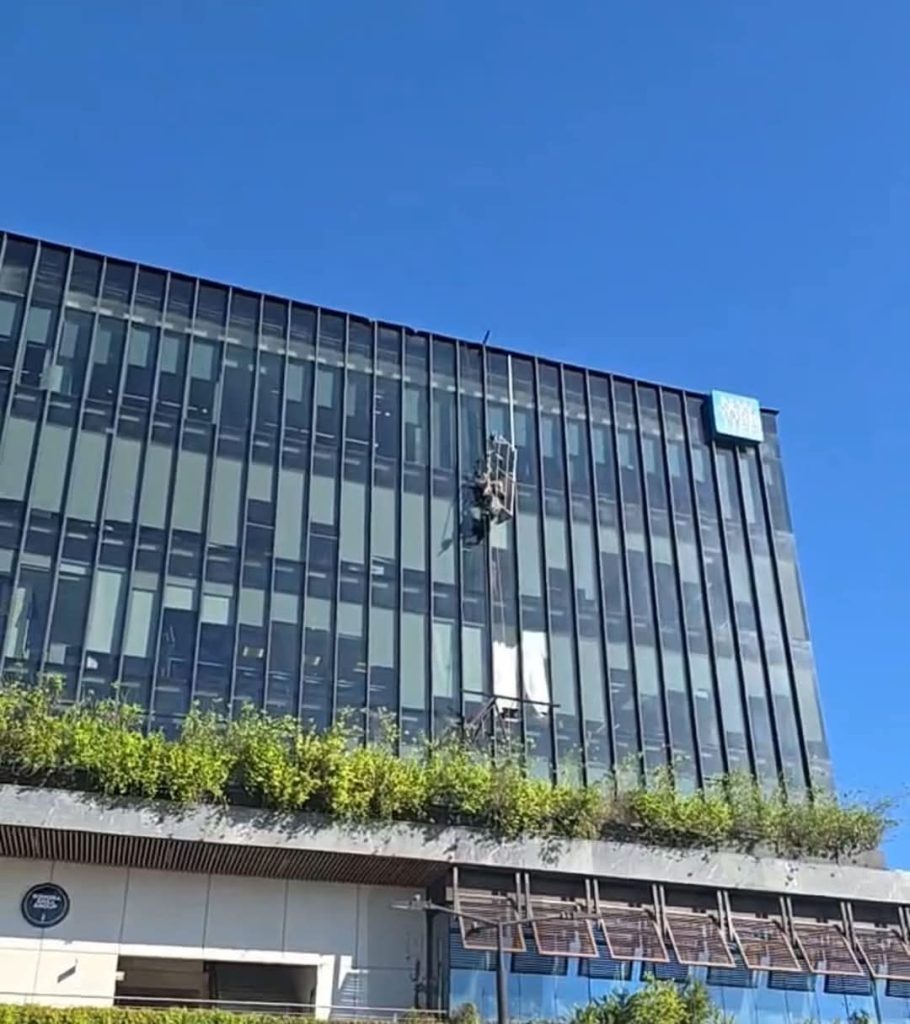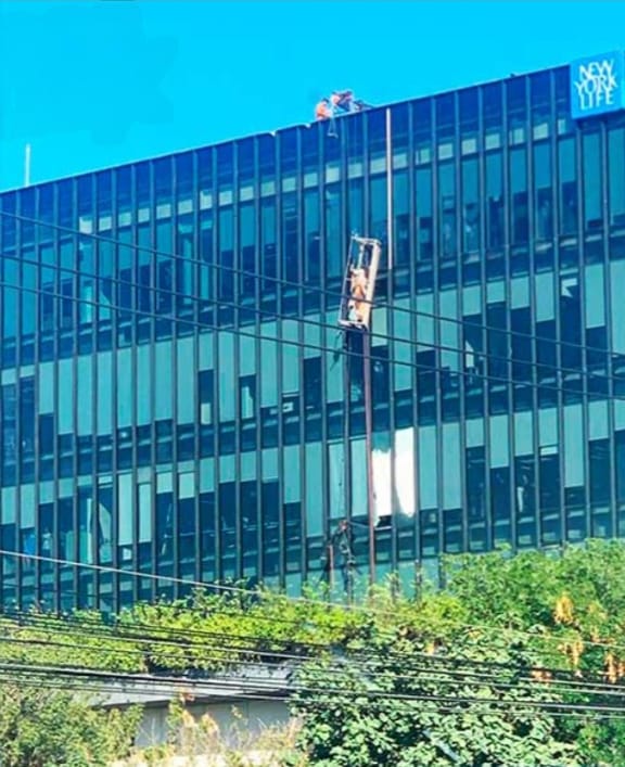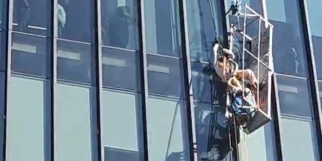 El obrero estaba en un andamio que colgaba de sogas desde la parte más alta de la torre. De pronto se desprendieron las de un lado, por lo que la estructura quedó suspendida y con ella el trabajador, a punto de precipitarse al vacío.