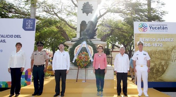 Mérida, Yucatán, 21 de marzo de 2019.- Con un llamado a continuar su legado de paz y Justicia, autoridades civiles y militares, encabezadas por la titular de la Secretaría General de Gobierno (SGG), María Fritz Sierra, quien acudió a nombre del Gobernador Mauricio Vila Dosal, conmemoraron el 213 aniversario del natalicio de Benito Juárez García,  prócer de la historia que consolidó a México como una nación libre y soberana.