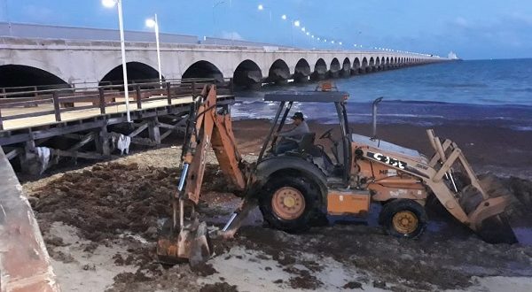 El funcionario explicó que los trabajos se iniciaron el martes sólo con el personal de la dependencia, limpiando a mano la zona entre el andador de madera y la calle 76, y agregó que desde las 4 de la mañana de este miércoles y con la ayuda de una retroexcavadora y volquetes, ya se ha logrado recolectar 56 toneladas de sargazo hasta el momento.
