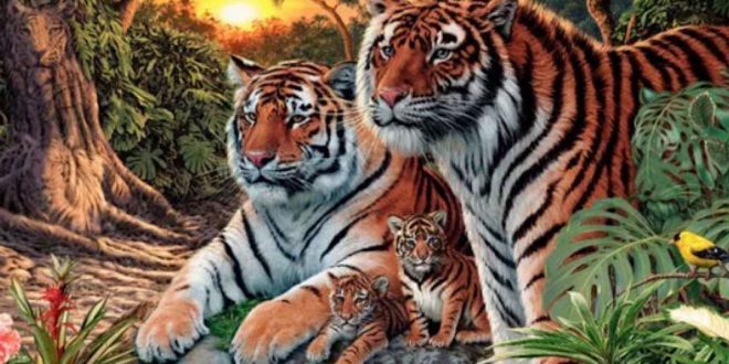 Al ver la imagen de forma inmediata puede observarse a una familia de cuatro tigres. Sin embargo, si prestamos más atención a los detalles notaremos que hay varios rostros de tigres fusionados con el paisaje.