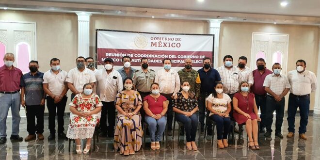 En estas reuniones de coordinación del Gobierno de México con autoridades municipales electas acuden como representantes del Gobierno federal el Comisario de la Guardia Nacional Francisco Díaz González, el Coronel Enrique Elvira de SEDENA, el representante del INPI Yucatán Dr. Domitilo Carballo, el Srio Mpal. Entrante Manuel Loría Santoyo, la subdelegada Flor Valdez, Alpha Tavera, Roger Ávila de Becas Benito Juárez, Alberto del Río de FND y Felipe Duarte de CONAFE.