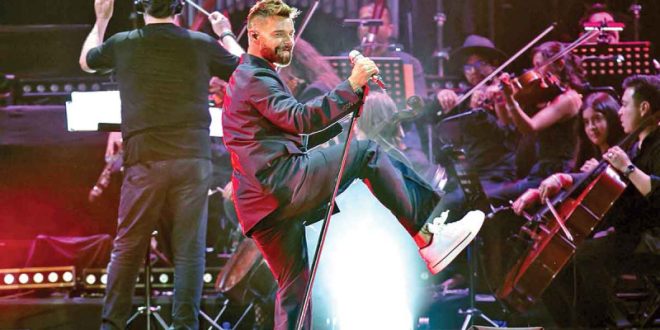 La orquesta de 50 músicos resonó en los más de 20 éxitos interpretados por Ricky Martín, quien lució un traje negro y tenis blancos para cantar Gracias por pensar en mí y La bomba, en la que el saco salió sobrando y dejó ver el torneado cuerpo del puertorriqueño, que días atrás mostró en sus redes sociales al desnudo, ya en territorio mexicano.