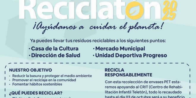 Progreso, Yucatán, 13 de septiembre de 2025.-Con el objetivo de sumar esfuerzos para alcanzar la meta estatal de 15 toneladas de PET tipo 1, el Ayuntamiento de Progreso, encabezado por el alcalde Erik Rihani González, se une al “Reciclatón 2025”, una iniciativa a beneficio del Centro de Rehabilitación e Inclusión Infantil Teletón (CRIT) Yucatán.