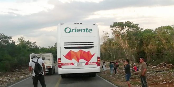 Kinchil, Yuc., 4 de julio.- Minutos después de las 7 de la noche, se suscitó un “rozón” de espejos retrovisores entre un autobús y una pesada unidad tipo tolva en el tramo de la mala leche Kinchil-Celestún, específicamente a la altura de la “curva del diablo”.