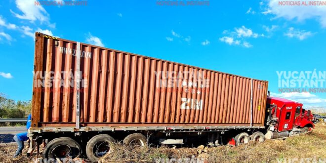 Mérida, Yuc., 21 de febrero 2022.- Dos moles de acero se dieron un llegue en la vía Mérida-Tetiz, lo cual causó que el operador de uno de ellos perdiera el control de la guía para salirse dramáticamente de la carretera.