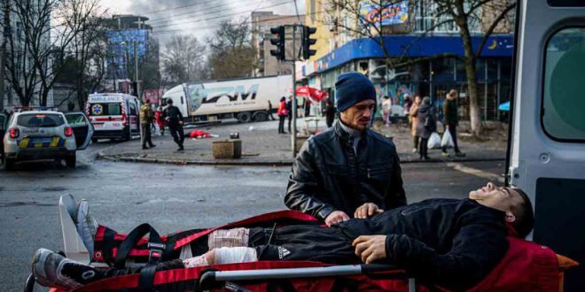 Los servicios de rescate intentaron salvarlo pero ya no respiraba”, declaró una mujer cuyo esposo, Oleksii, falleció en los bombardeos. Agachada junto a él, con la mirada vacía, agarraba las manos ensangrentadas de su marido.