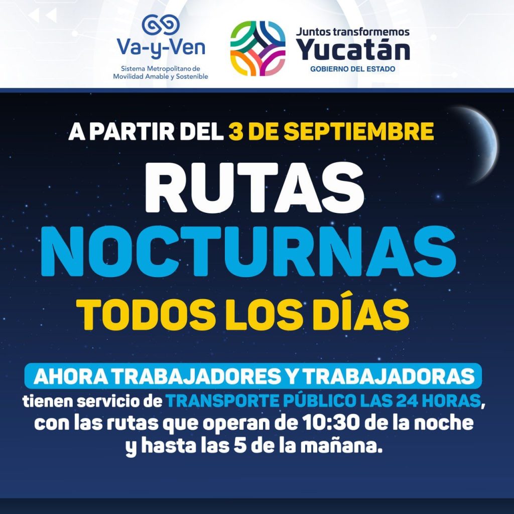 Mérida, Yucatán, 25 de agosto de 2023.- A partir del próximo domingo 3 de septiembre, el servicio de rutas nocturnas del sistema de Transporte “Va y Ven” será todos los días de la semana para seguir beneficiando la economía de las y los trabajadores yucatecos, anunció el Gobernador Mauricio Vila Dosal.