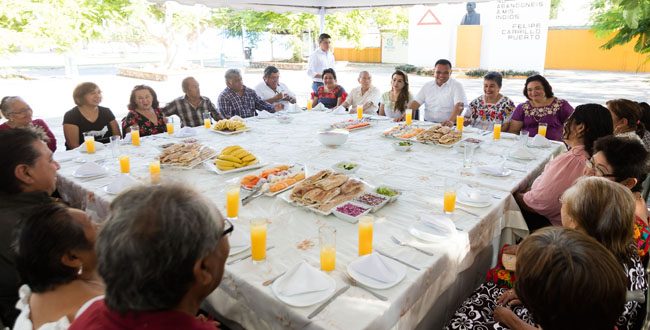 En punto de las 9:00 horas de este domingo y antes de encabezar sus últimos eventos públicos, el mandatario compartió los alimentos con 19 vecinos de este lugar, al nororiente de esta ciudad, cobijados bajo la sombra de un frondoso árbol de flamboyán del parque que lleva el nombre del prócer yucateco, en una agradable mañana.