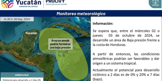 Indicó que como remanentes de “Helene” se han pronosticado lluvias ligeras y chubascos aislados en algunas zonas del oriente en tanto que continuarán las lluvias de moderadas a fuertes por onda tropical en el centro y sur del estado que abarca Sotuta, Mérida, Izamal, Oxkutzcab y Tekax, entre otras demarcaciones.