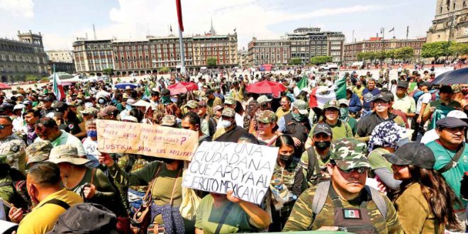 A mediodía, la marcha arribó a la plaza de la Constitución; el contingente de amigos familiares y ciudadanos que apoyan a las fuerzas armadas se colocaron frente a Palacio Nacional para expresar su sentir ante la situación de los efectivos de la Secretaría de la Defensa Nacional.