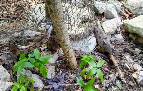 Kinchil, Yuc., 21 de noviembre.- La señora Hilaria Felipa Canul Ku, de 58 años, vecina de Kinchil, tuvo un menudo susto este mediodía, al ver que en su patio una boa constrictor estaba enredada en una red que sirve para sus pollos, por lo que mejor dio aviso a la Policía Municipal.