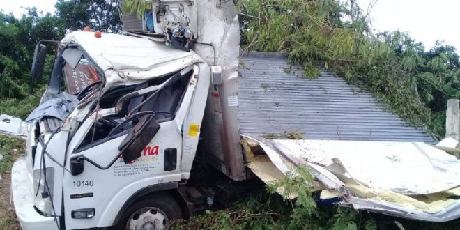 AKIL.— Un aparatoso accidente que provocó que un camión de tres toneladas cargado de lácteos y carnes fría quede en pedazos, se registró esta mañana a la altura del entronque de las carreteras Muna-Peto y Akil-Teabo (vía rápida a Mérida).