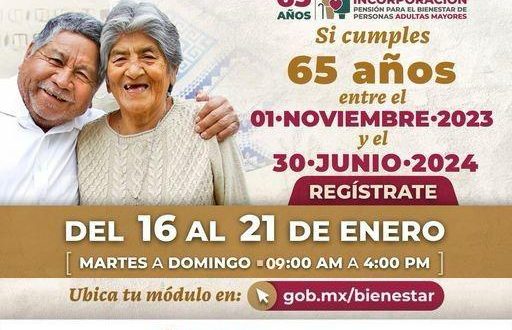 La Delegación de Bienestar Yucatán, invita a todas las personas que cumplan los 65 años entre los meses de noviembre 2023 y junio 2024, acercarse a los Centros de Atención Regional para brindarles debida atención de lunes a domingo de 9 am a 4 pm, ya que el próximo 21 de enero concluirá la incorporación.