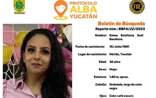 MÉRIDA, Yuc., 31 de octubre 2023.- Familiares de Emma Estefanía Xool Barahona, de 32 años de edad, pidieron apoyo a las autoridades para tratar de localizarla, pues no se sabe nada de ella desde el pasado 16 de octubre, así que se activó un Protocolo Alba para tratar de dar con ella.
