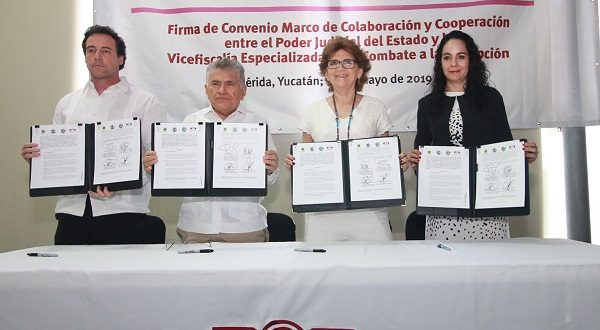 Mérida, Yucatán, 29 de mayo de 2019.- El combate frontal a la corrupción e impunidad es una prioridad para la actual administración encabezada por el Gobernador Mauricio Vila Dosal, aseguró la titular de la Secretaría General de Gobierno (SGG), María Fritz Sierra, al atestiguar la firma de un convenio entre el Poder Judicial del Estado y la Vicefiscalía Especializada en el Combate a la Corrupción.